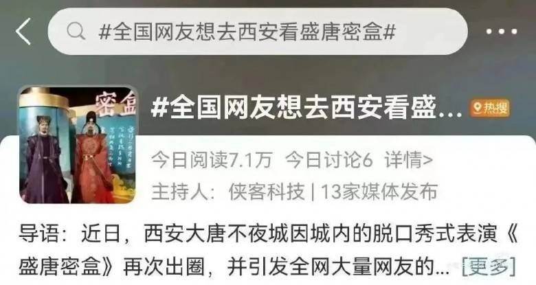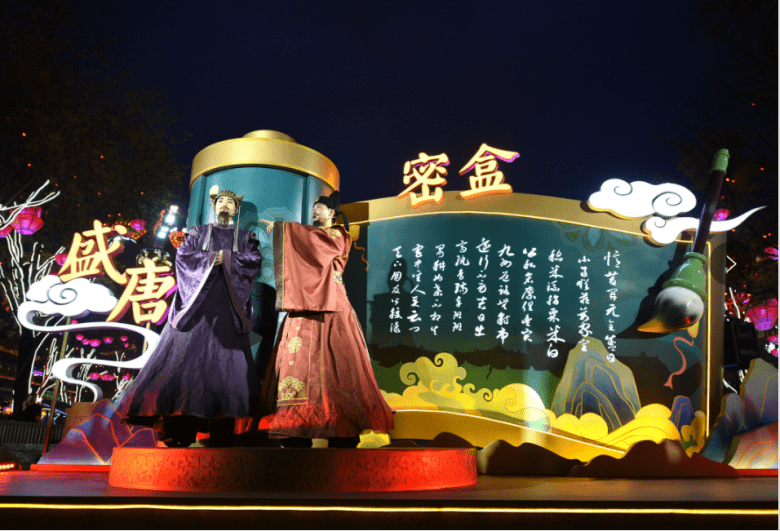 要说当下西安最具人气的文旅演艺,非西安大唐不夜城推出的“盛唐密盒”莫属,该互动节目由“房玄龄”和“杜如晦”的扮演者出题,随机挑选游客上台参与答题。“房谋杜断”组合配合默契,与游客进行沉浸式互动,使得整个表演爆梗不断,充满了乐趣。