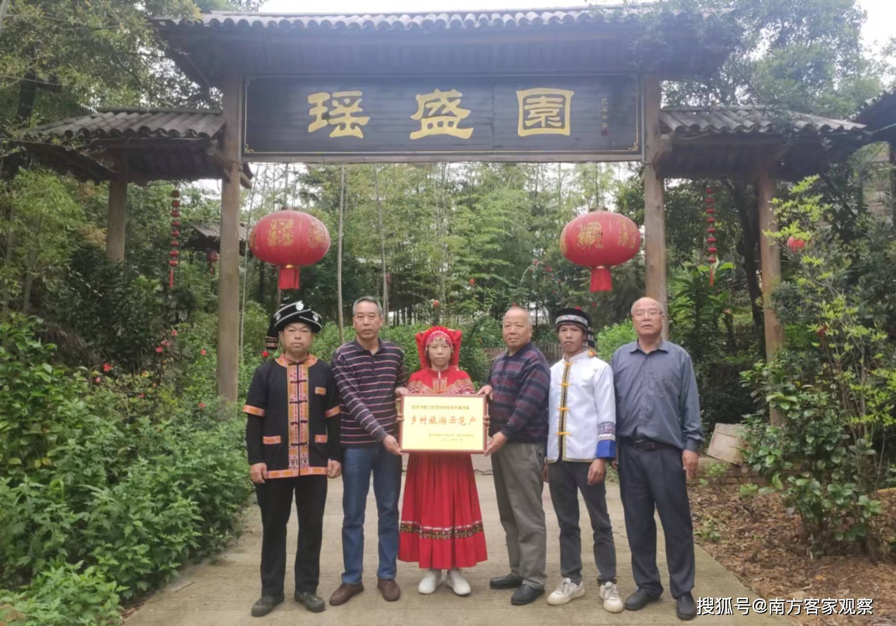 4月28日,韶关市曲江区关工委常务副主任曾庆荣、曲江区统战部民宗局有关领导一行来到该区枫湾镇茶园山瑶族村委分别为瑶族创业青年邓秀平、邓文圣授予“乡村旅游示范户”牌匾。