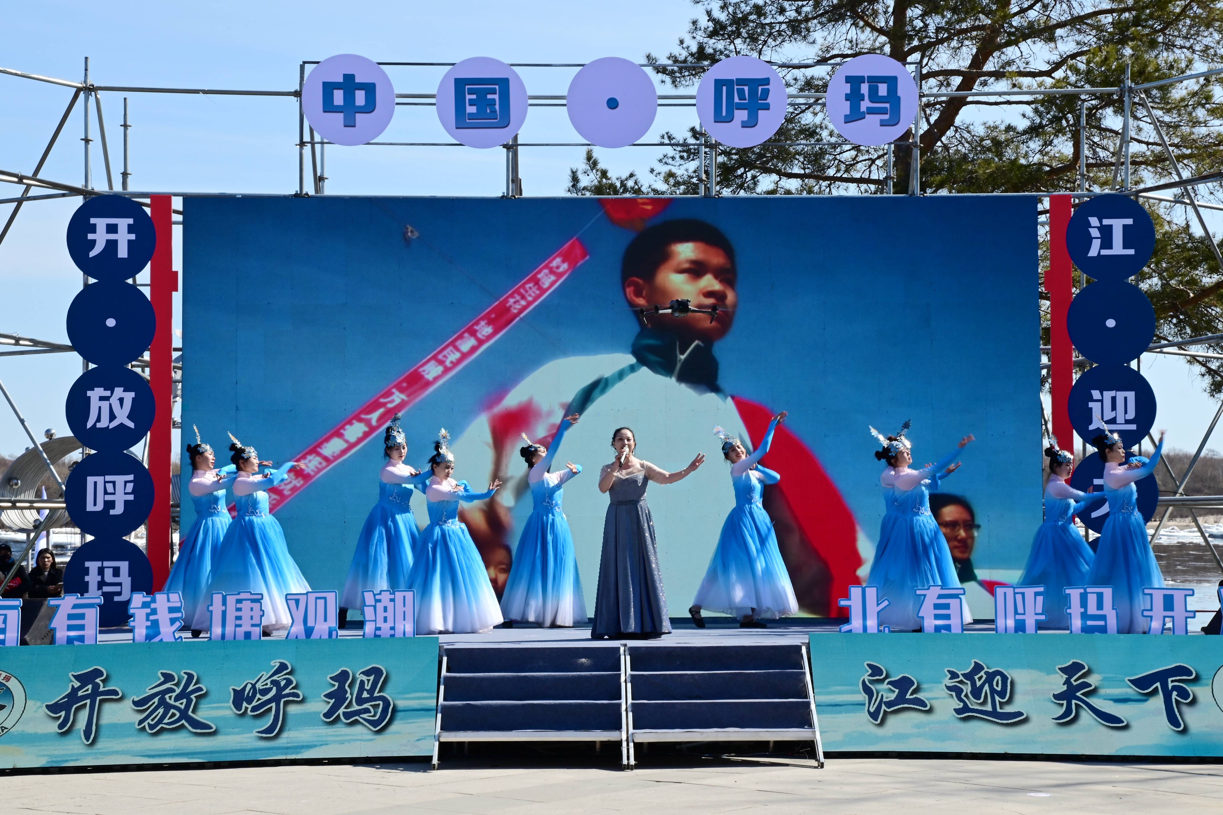 4月28日,黑龙江省呼玛县江畔公园内彩旗招展,礼炮轰鸣,鼓乐声声,人头攒动,以“南有钱塘观潮,北有呼玛开江”之“开放呼玛,江迎天下”为主题的黑龙江省呼玛县第十届开江主题文化周活动盛装启幕。