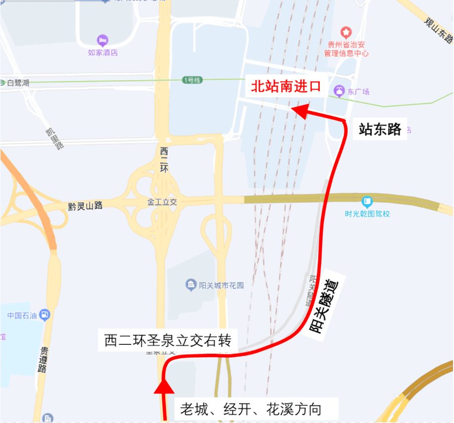 路线2:老城、经开、花溪方向车辆沿西二环圣泉立交右转进阳关隧道可直接进入北站南广场