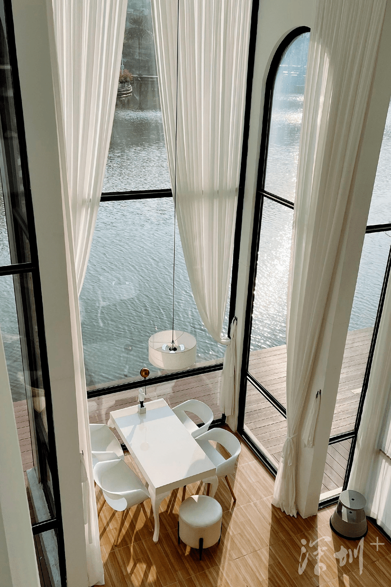 位于湖畔的个性化图书馆。白色欧式建筑外观,以黑色线边勾勒出轮廓,搭配顶天立地的超大落地窗,白色纱幔随风飘动,浪漫通透、圣洁高雅,建筑的简约之美呈现得淋漓尽致。