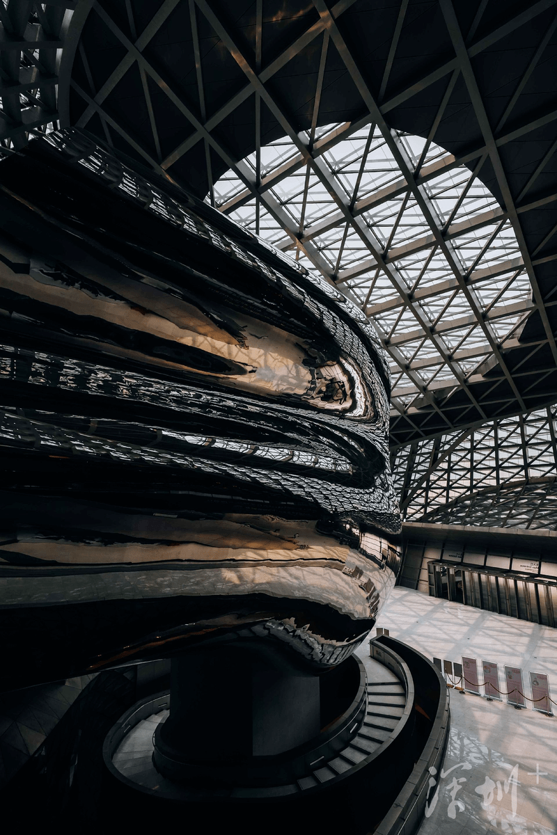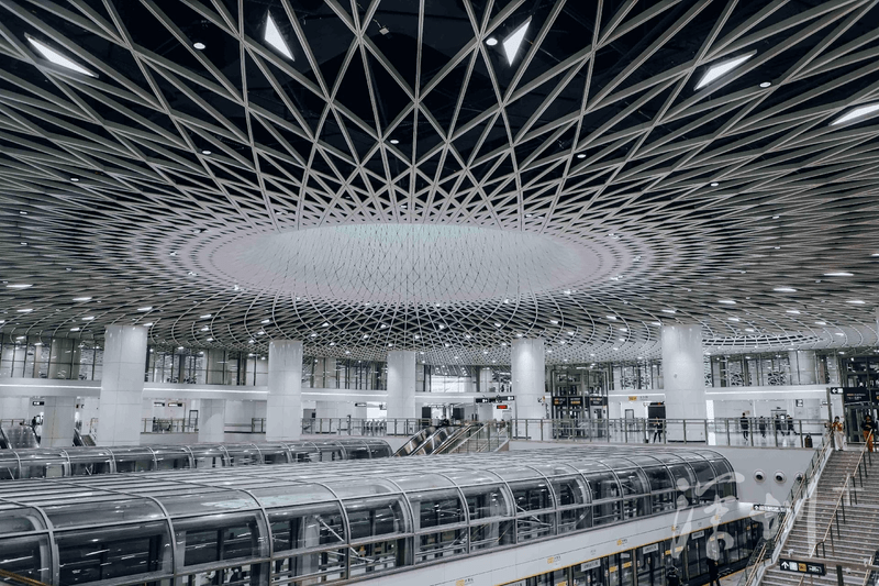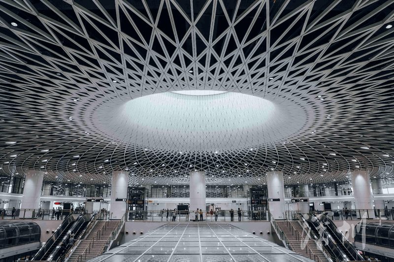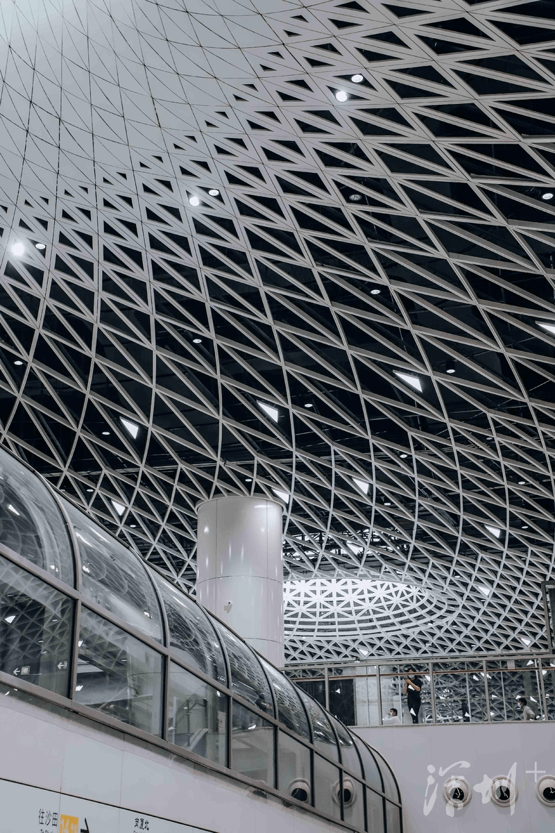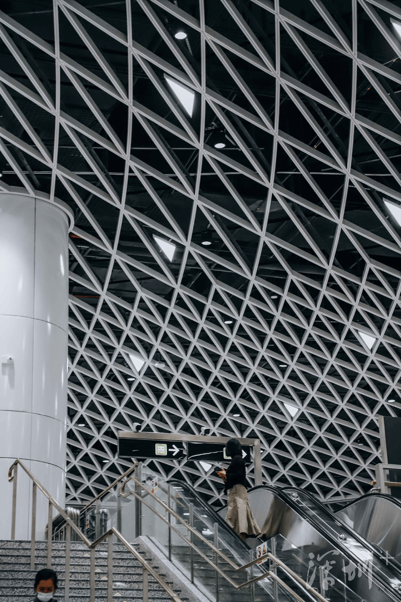 超级交通枢纽岗厦北“深圳之眼” 位于福田中心区,是国内目前最大的轨道交通单体工程。该枢纽以“深圳之眼”为主题,以核心天井为基点,运用“费马螺旋”数学原理吊顶,将创意延伸到了三维空间。无数极具科技感的线条从四面汇聚于“深圳之眼”,又向八方舒展开来,如光芒四射的星,赋予空间视觉张力,呈现出深圳包容、国际化的城市气息,仿若通往未来世界的枢纽站点。