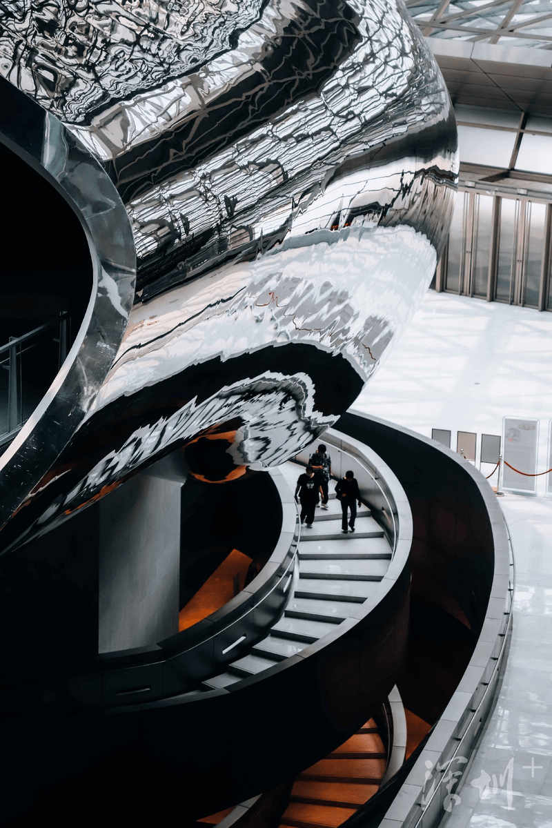 深圳市当代艺术与城市规划馆是由有“解构主义急先锋”之称的奥地利蓝天组设计的。这座巨型镜面不锈钢的“云建筑”是具有强烈现代性的“概念建筑”,由大量倾斜、扭曲、旋转曲面构成。建筑结构体系复杂,金属纽带连接两馆,充满科幻感和未来感。因充分考虑到馆内展示艺术收藏的需求,其高空间、开放式设计使得馆内展示空间极为阔敞明亮。该馆风格大胆前卫,极具视觉冲击力,是想象力与科技的完美结合。