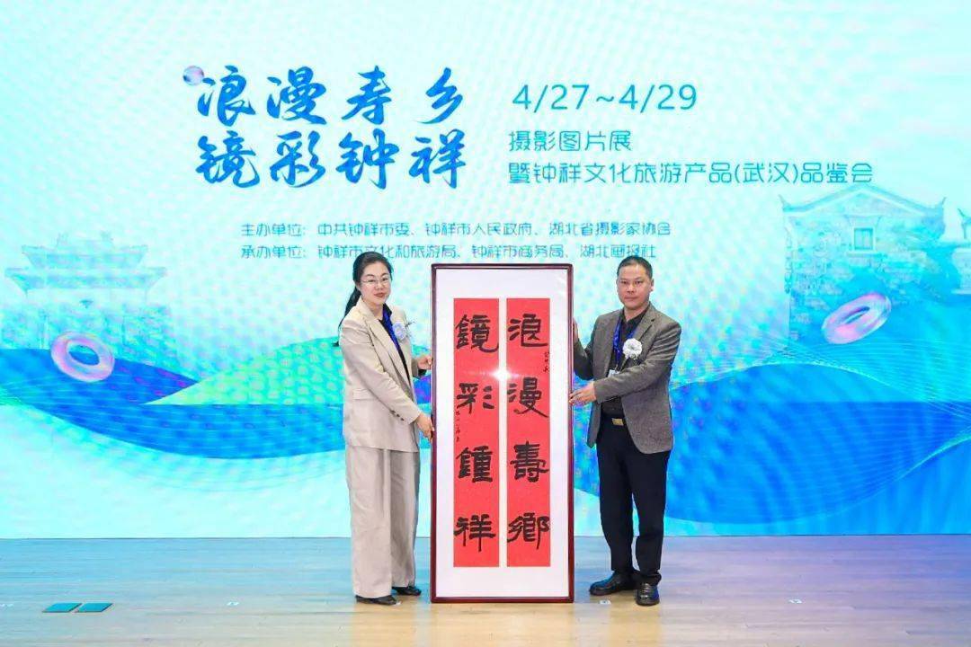 随后,中国书法家协会会员、湖北画报社董事长陈明华向钟祥市文旅局局长郭庆赠送书法作品《浪漫寿乡 镜彩钟祥》,苍劲有力、飘逸自如的作品,写尽了长寿钟祥的诗意浪漫。