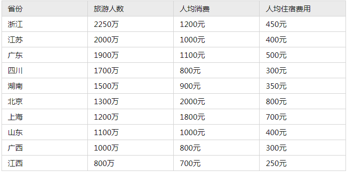 从表格数据可以看出,浙江、江苏和广东三个东部沿海省份的旅游人数和人均消费均位居前三,而四川和湖南两个中部省份的旅游人数也持续攀升。同时,可以发现,各省份的人均住宿费用普遍在300-800元之间。