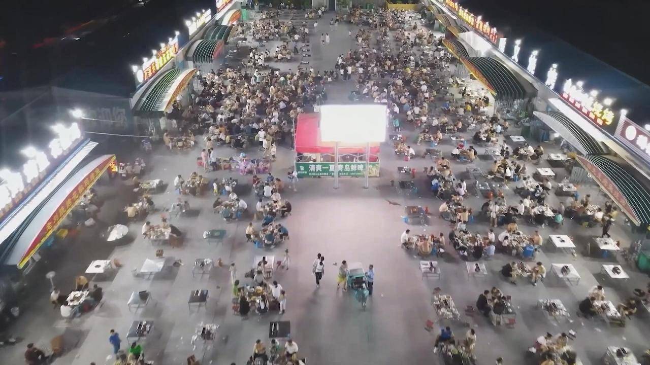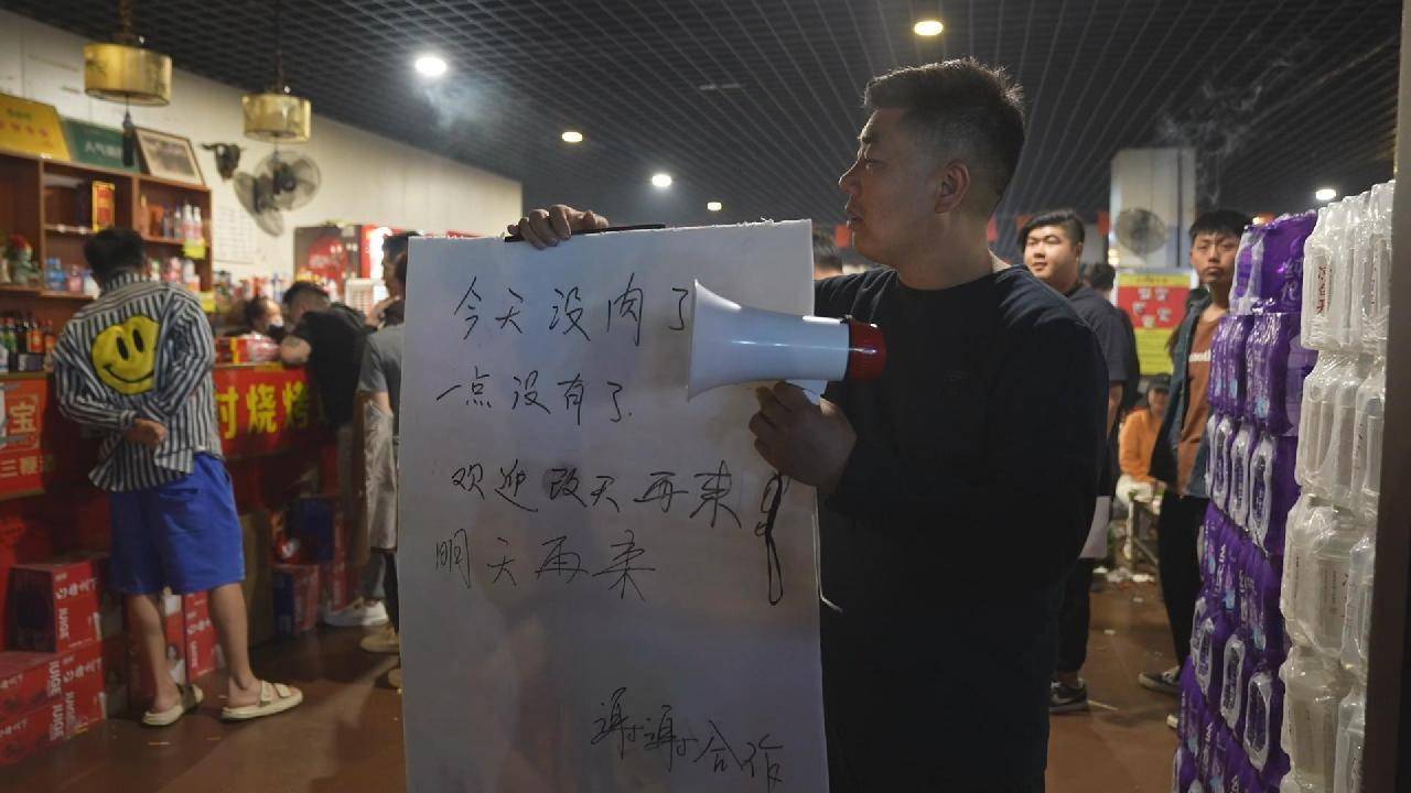 这个下沉式美食广场集中了多家烧烤店,是淄博最热门的“网红”打卡地。营业不到4个小时,杨本新烧烤店里的肉就已全部售罄。然而,等待的顾客依然大排长龙,杨本新只好无奈开始“撵客”。