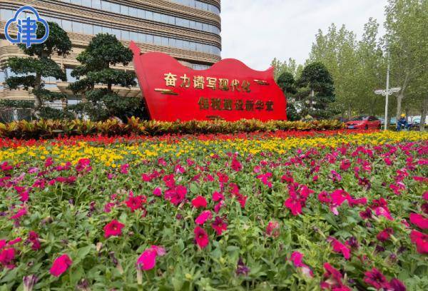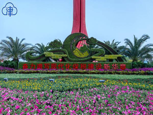 这个“五一”,保税区运用多种景观小品,搭配高、中、低不同层次的绿植及花卉植物组成立体景观花坛。在空港中心大道主入口设置的主题立体景观运用飘带造型组成一副“绿水青山”的生态美景。设在西三道空港景观湖畔的未来之窗景观,以拱门造型为框景,搭配流水般的模纹花坛,烘托“科技、创新、绿色”的发展理念,同时点缀Led发光树叶造型丰富景观夜景效果。开拓未来景观布置在临港商务大厦南侧喷泉周边,景观主体突出,色彩鲜明,运用榕树、变叶木、一串红、孔雀草等植物营造自然式植物花境。位于海港区域的中国(天津)自由贸易试验区政务服务中心门前两侧摆放了自然式榕树盆景花坛,简约大气,靓丽美观。