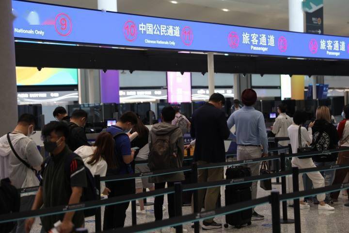 在杭州萧山国际机场出境大厅,正在候检的王女士带着一家人准备去香港迪士尼游玩。