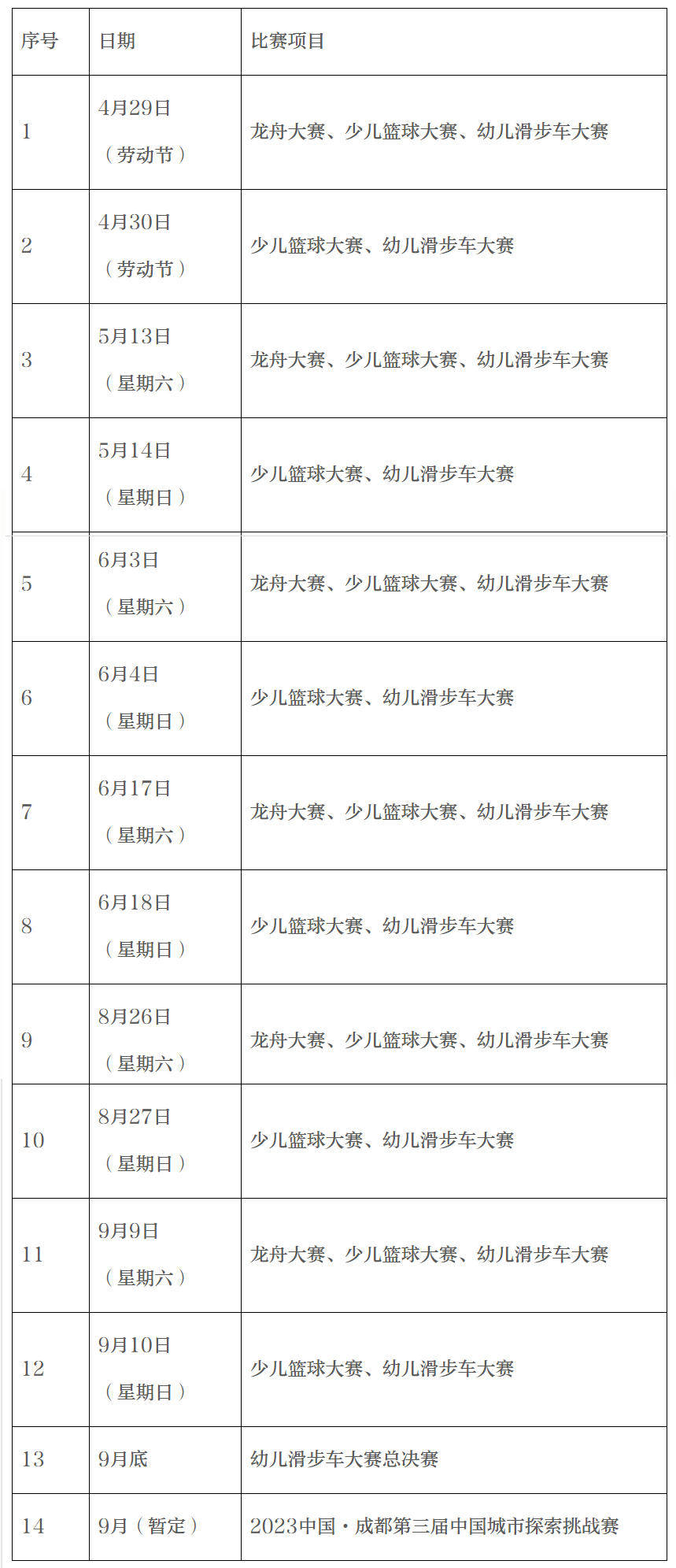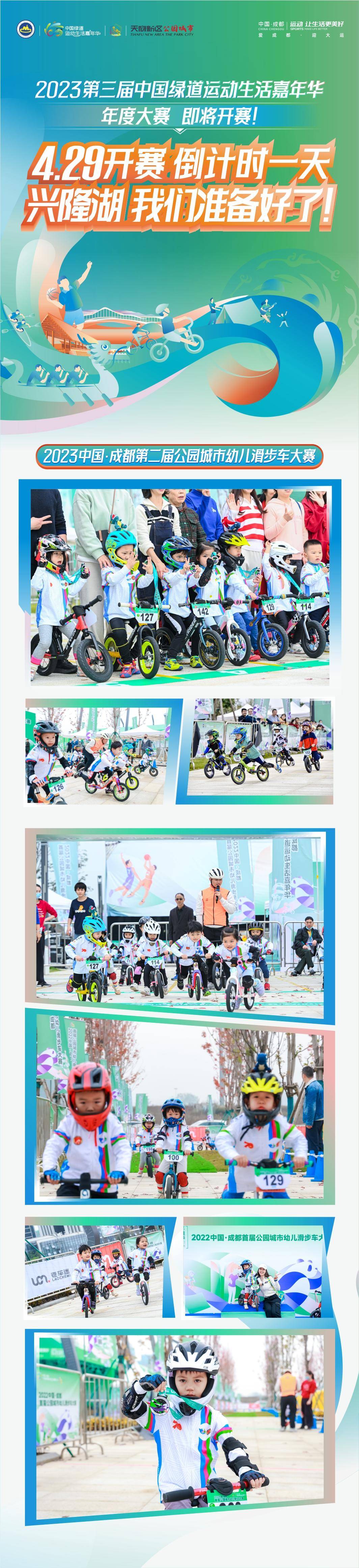 秉承“齐参与·共赋能”的办赛理念,在充分总结往届举办经验基础上,以专业赛事为引领,以全民参与为目标,绿道嘉年华城市自主IP赛事再次启航,提档升级为年度大赛并将贯穿全年。明天, 年度大赛将在天府新区兴隆湖畔盛大开赛,2023中国·成都第二届公园城市幼儿滑步车大赛、少儿篮球大赛、公园城市龙舟大赛,上百场包含“周赛+月赛+季赛”的精彩年度大赛,将持续至10月,形成全年不断、全民参与的盛况,以吸引更多全国各地的游客来成都参与到嘉年华当中,通过运动的方式度过一个又一个充满活力的周末时光,带动亲子家庭参与户外运动,推广健康生活方式,营造活力健康城市氛围,将健康运动理念传递到千家万户,实现全民健身蔚然成风。