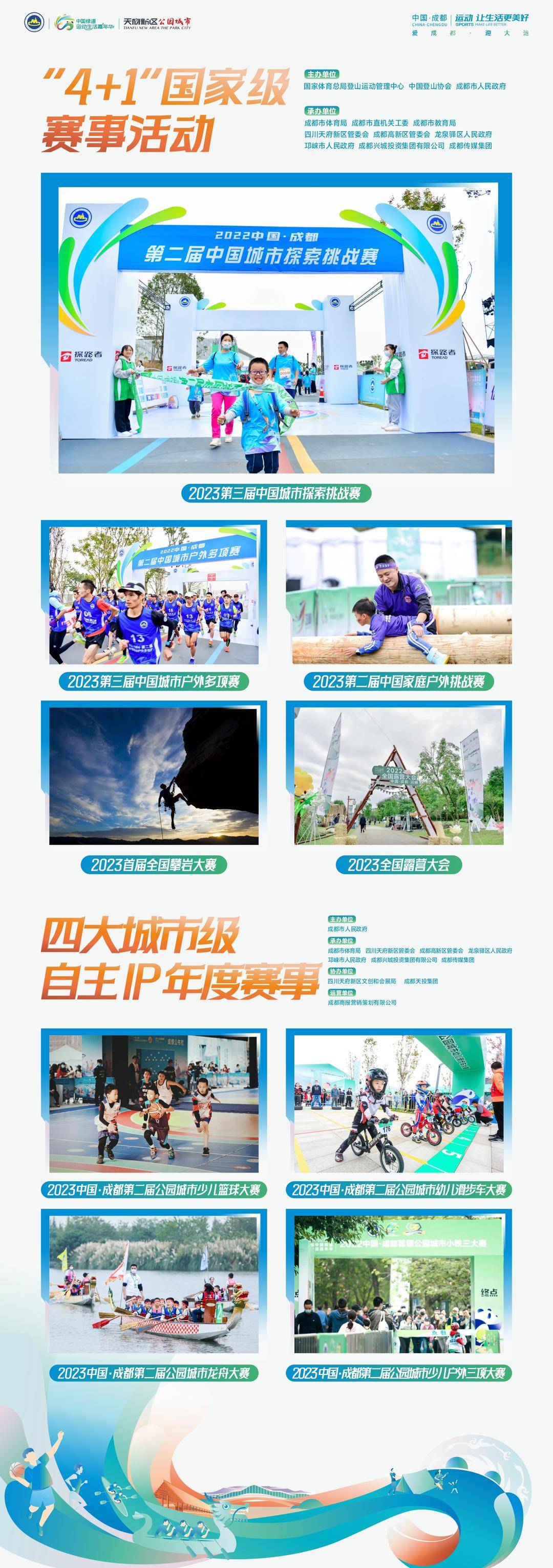 今年绿道嘉年华赛事活动丰富多彩,在举办好第三届中国城市探索挑战赛、第三届中国城市户外多项赛、第二届中国家庭户外挑战赛三大国家级赛事的基础上,还将引入又一国家级赛事“全国攀岩大赛”,同时全国露营大会也将在成都举办,形成“4+1”的国家级赛事和活动,助力成都户外运动高频词、高质量发展。