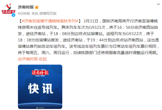 3月31日,国铁济南局将开行济南至淄博烧烤游周末往返专线列车。具体列车车次为G9321次,将于16:56分由济南西站始发,途经济南站,于18:08分到达终点站淄博站。返程列车为G9322次,将于18:38分由淄博站首发,途经济南站,于19:44分到达终点站济南西站,这也是淄博站首列始发动车组列车。该专线动车组列车票价与日常动车组列车票价相同,将于每周五、周六、周日运行,后续铁路部门还将根据客流量适时调整运行周期。