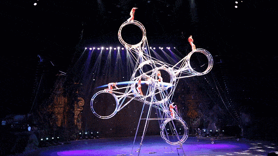 舞台灯光一亮巨大的飞轮展现在大家面前表演者站上飞轮上疯狂转动时还会做跑步、跳绳等极限表演全程没有威亚,全靠默契与技能每一个动作都在挑战你的心跳!