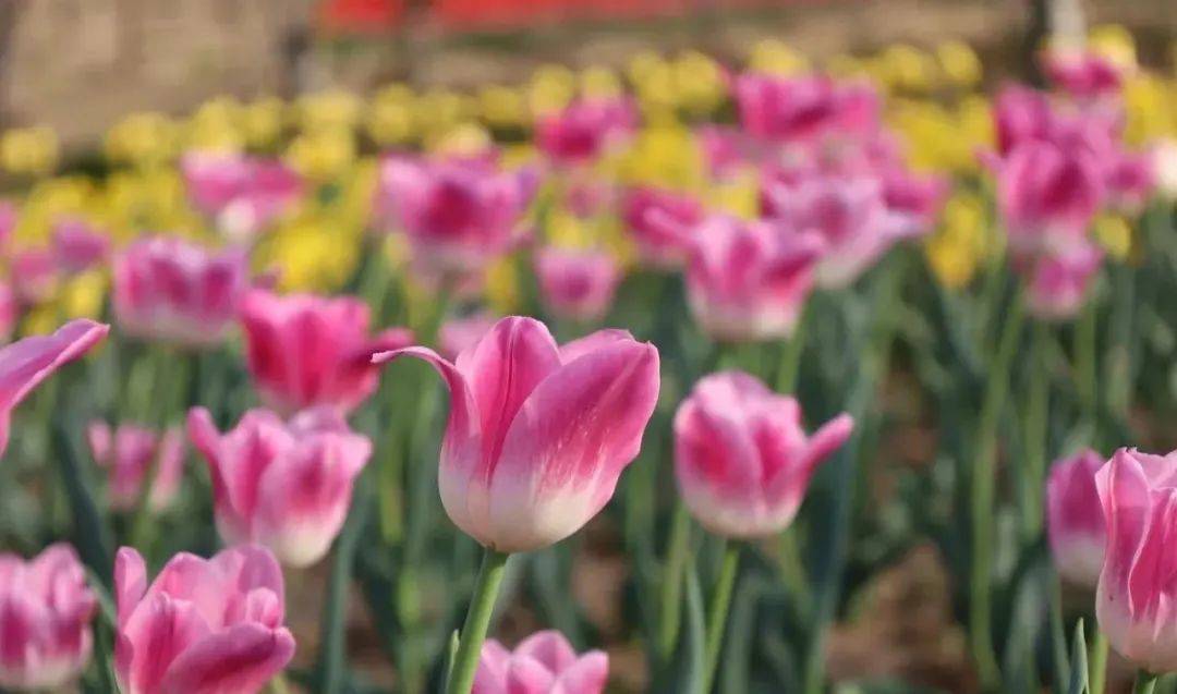 为了方便大家赏花打卡,我们可以这样玩:从月季公园北入口进入,沿着凌波花柱向东面走,在通往滨水花丘的路上,您将会看到各色各类的郁金香。
