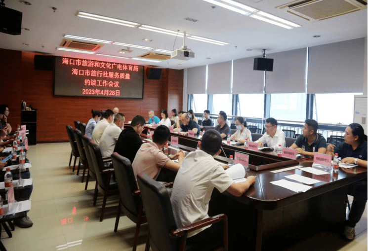 2023年4月28日上午,海口市旅游综治办组织召开海口市旅行社服务质量约谈工作会议,对今年一季度投诉量前十的 恒彩国际旅行社、海南慧通国际旅行社、海口纯美旅行社、海南琼顺旅行社、海南结伴游国际旅行社、海南玩家旅行社、海南美途旅行社、海南禾兴国际旅行社、海南潘多拉旅行社、海南悦途国际旅行社等10家旅行社进行集体约谈。海口市旅文局、海口市综合行政执法局、四个区旅文局、海口市旅行社协会、七大旅游集团负责人参加会议。
