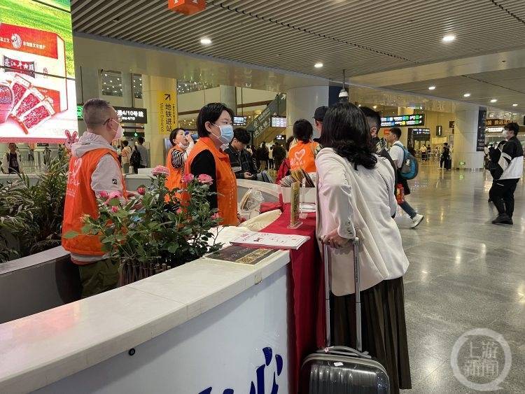 “你们可以推荐五一去哪里玩吗?我想去你们本地人去的景点。”来自广州的旅客王嘉和同学走出重庆火车北站北广场的出站口,看见上游新闻志愿服务队在便民服务中心服务,便过来咨询。