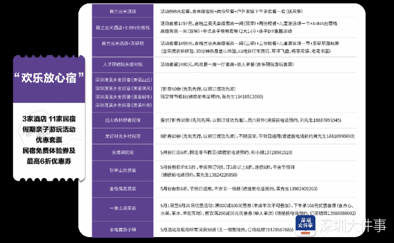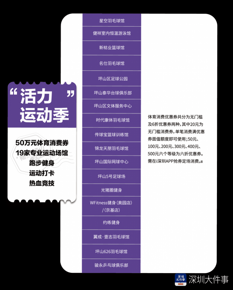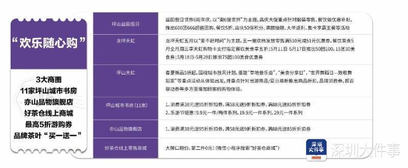 值得一提,本届文旅季,坪山有超过400家商户参与让利促销活动,活动分为“欢乐放心宿”“快乐随心购”“缤纷自在食”“活力运动季”四个板块。其间,格兰云天等3家酒店和11家民宿将推出假期亲子游玩活动优惠套票、民宿免费体验券及最高6折优惠券;坪山益田假日、坪山天虹、龙坪天虹3大商圈、11家坪山城市书房、亦山品物旗舰店、“好茶仓”线上商城超400家商户倾情加盟。龙坪天虹最高优惠五折,“好茶仓”线上商城“买一送一”;11家特色美食让你感受不一样的坪山,429元即可享受燕子屋日式料理单人套餐,汇厨西餐厅成人自助晚餐仅238元/位;50万元体育消费优惠券精彩抢不停,市民可通过在“i深圳”一键预约平台发放20元、50元、100元、200元、300元、400元、500元优惠券,跑步健身、运动打卡、球场竞技均可使用。