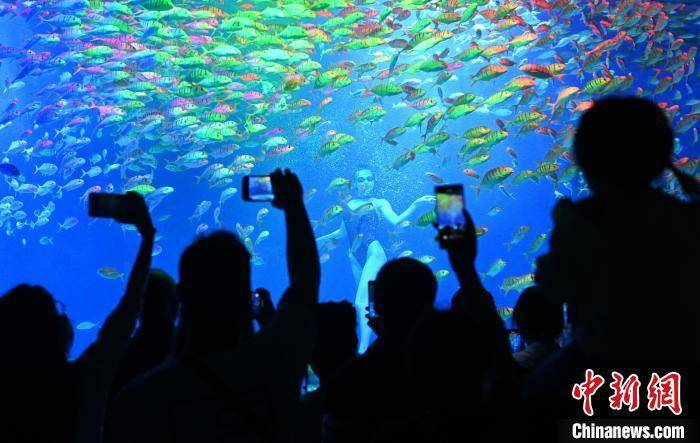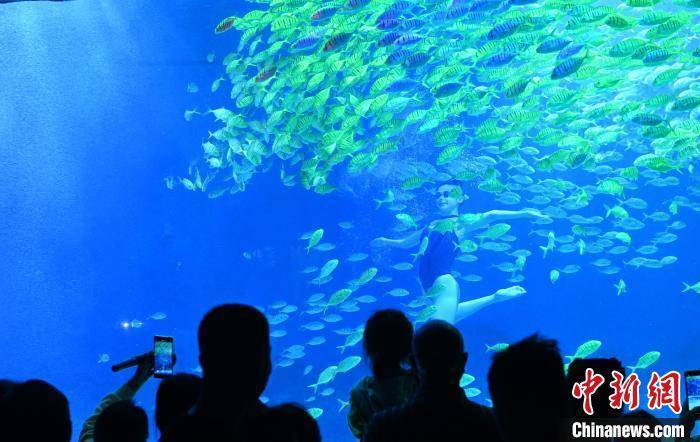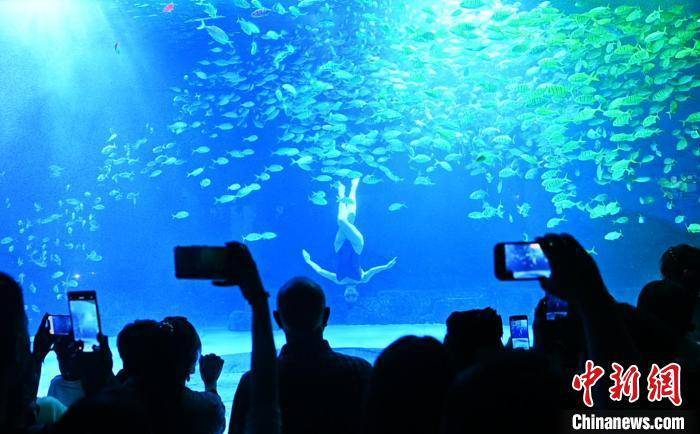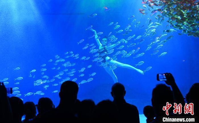 4月28日,在重庆汉海海洋公园内的圆柱形玻璃缸体中,上万尾的海鱼上演“群鱼风暴”,同时水下芭蕾演员入水和鱼群一起互动,给现场观众带来了一场震撼的视觉盛宴。