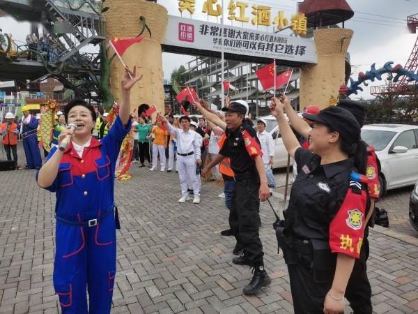 随着一位正在操作摄像机身穿导演马甲的工人镜头开始移动,一首《幸福在哪里》拉开了这场劳动者自导自编自演的“快闪”活动序幕,来自美心红酒小镇景区各个岗位的职工伴随着动感的节奏跳起舞蹈。随着现场气氛越来越浓烈,两名厨师手持漏扫与锅铲充当起了这场音乐会的“指挥棒”,一位工人大哥与一把铁锹跳起了交际舞,一位清洁工也跟着节奏跳起了自己的“劳动style”……他们的热情感染了围观的游客,不少人也加入到劳动者大联欢中。