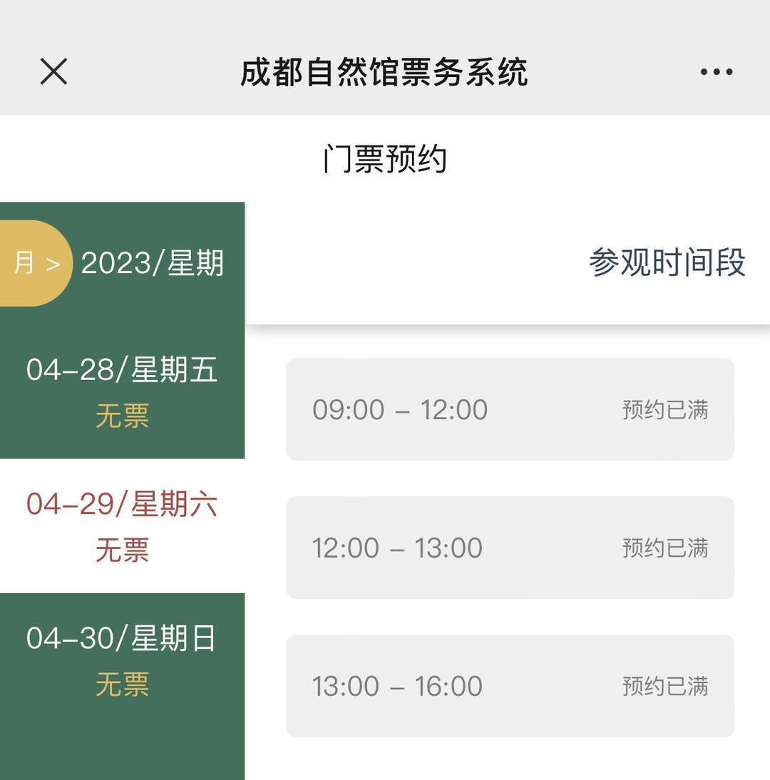 随后,封面新闻记者查询了成都自然博物馆 (成都理工大学博物馆)的“观展预约”通道,其中显示4月29日、30日的预约已满。