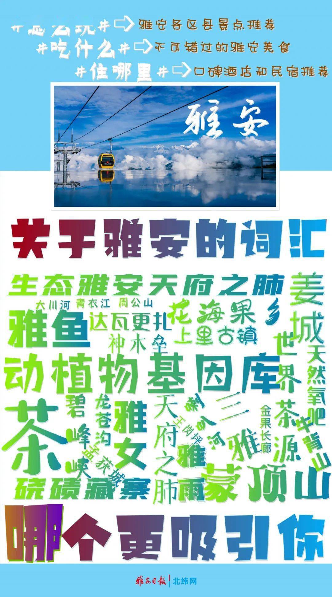 不管你来没来过雅安,是本地人还是外地人,雅安各县区都有属于自己的“专属”耍法,报姐这就以雅安各区县为单位, 以“怎么玩、怎么吃、住哪里”为主题,为大家奉上雅安本地人推荐的干货指南, 赶紧来解锁→