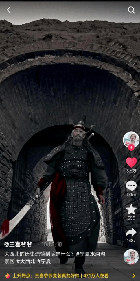 4月27日,抖音红人牧飒一条“在水洞沟部落做一回原始人”的视频热度持续攀升,短短几个小时霸占同城榜第一名。与此同时,三喜爷爷在水洞沟景区拍摄的变装视频也成为抖音上升热点,获得网友一致好评。