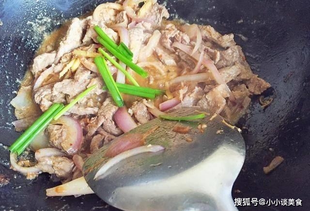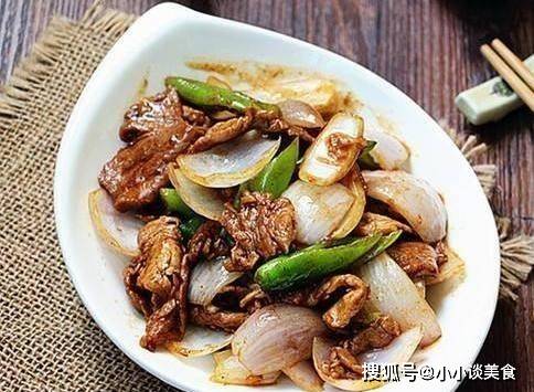 将洋葱快速炒至变软。如果油太少,可以从锅边倒入一些水,继续快速搅拌。这将使洋葱煮得更快,质地和风味更好,味道更好。洋葱煮熟变软后,加入牛肉和青辣椒并搅拌。过锅的过程中加入适量的盐和鸡精,加少许白糖,快速搅拌,即可出锅。