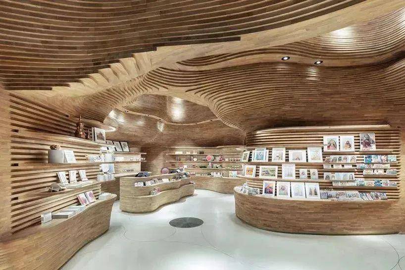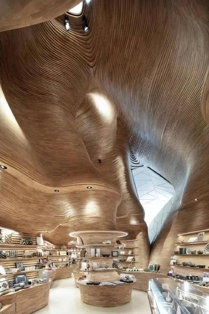 设计以卡塔尔的自然景观 “光洞 (dahl al misfir)”为灵感,使用了 40000 件切割木材, 利用 3D 建模,并在多哈进行手工组装,创造了洞穴般的内部空间。