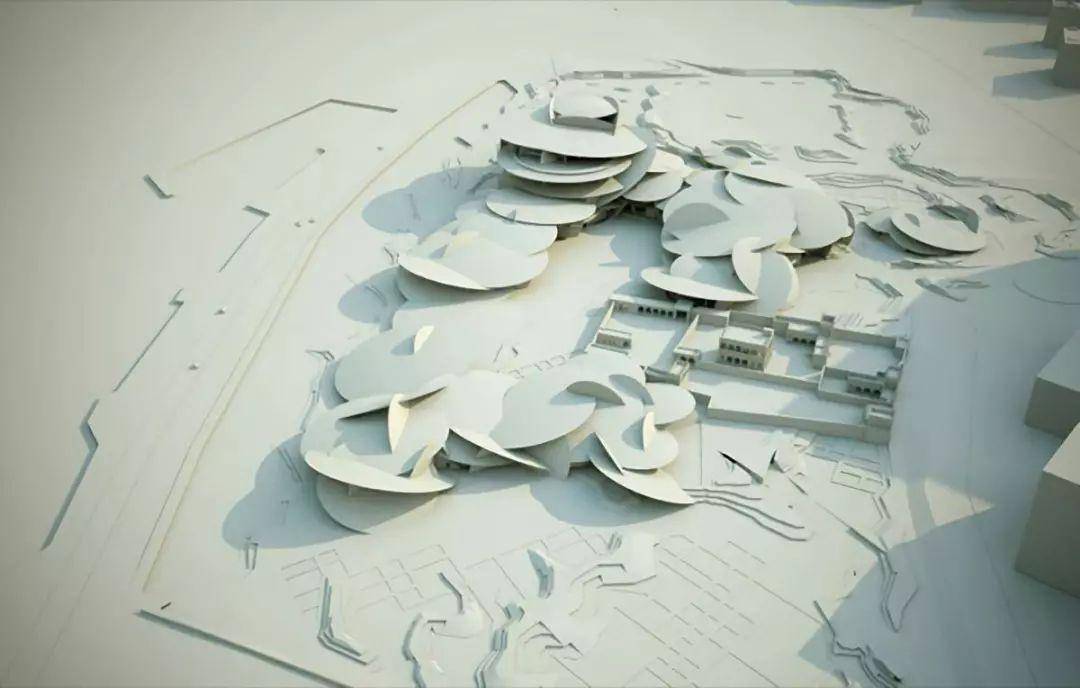 设计师设计的建筑是一个类似‘沙漠玫瑰’的东西,用了同样的原理,但是尺度要大得多,四百米长,三十多米高。项目体现了超现代性,那些交错的圆盘将使参观游客从旁观者转变为参与者。它是一种偶然的叠加,好像是在浪潮的顶部,随后又不知道跌到何处。建筑空间有高有低,是一系列的空间转换。
