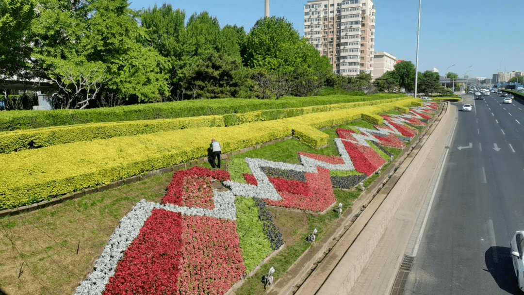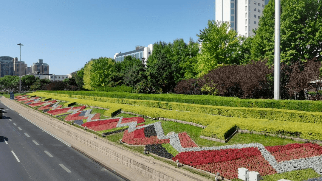 阜城门桥区两侧绿地内设计简洁、大气、大尺度的流线型花带,对称点缀26个缀花花球,四角绿地点缀8个花球,通过红、黄、粉三种颜色“绘制”出一幅繁花盛放的景象,展现城市祥和美好的氛围。月亮湾、百花园、京韵园绿地等街头口袋公园,以自然式花境形式进行地栽花卉布置,形成色彩鲜艳的基底。月坛南桥辅路东口与广宁伯街交叉路口,设计创新造型的花卉小品,形成二环路沿线的亮点。