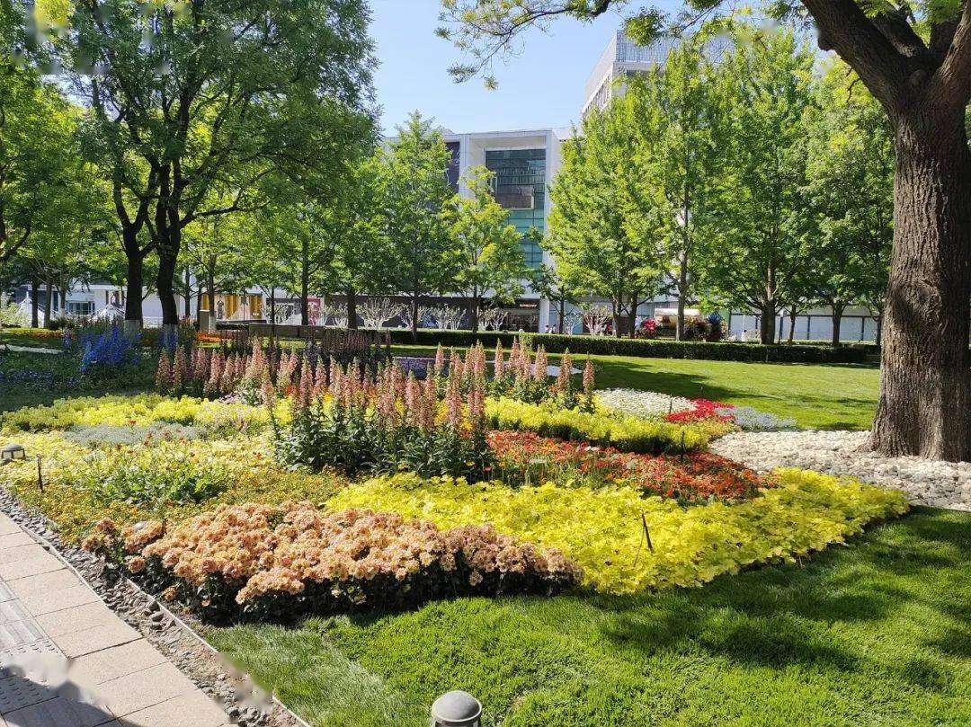 今年金融街中心绿地花卉布置,突出“圆”的 元素,通过切分、组合等几何构成形式,形成20个专色花境花岛,外形简洁现代时尚,每个花岛内是以同色系不同高矮植物组团的自然式花境,现代时尚与自然生态互相融合。
