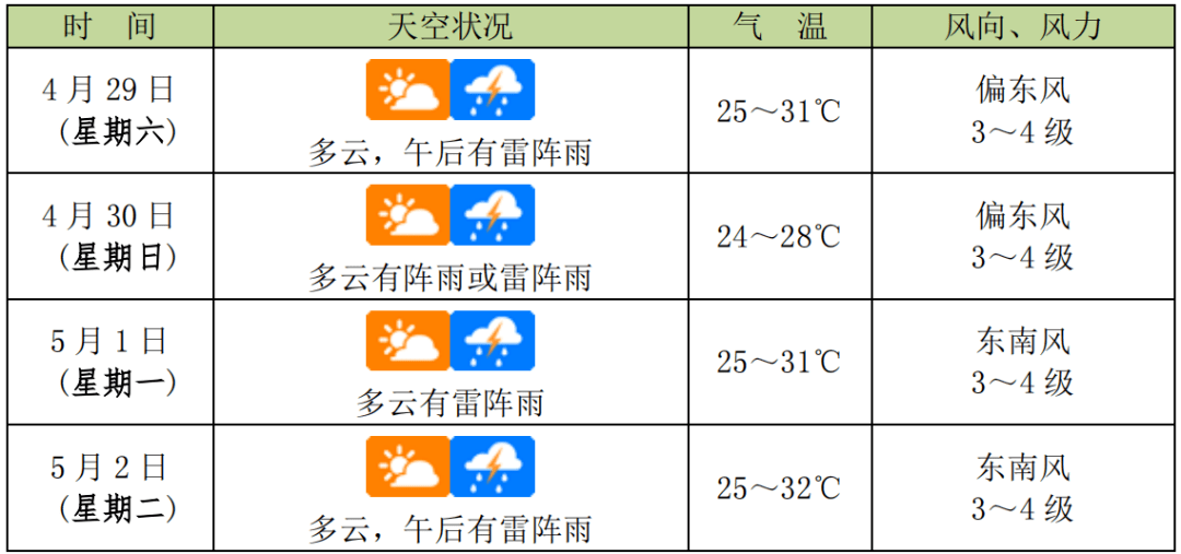 温馨提示:预计,4 月 29 日~5 月 2 日,受切变线影响,我市多雷阵雨天气。演唱会当天(5 月 2 日),气温偏高,紫外线较强,对皮肤有较大伤害,在户外,应打遮阳伞,午后有雷阵雨天气,户外活动注意防雷避雨。