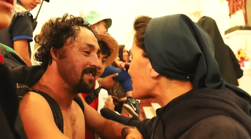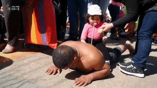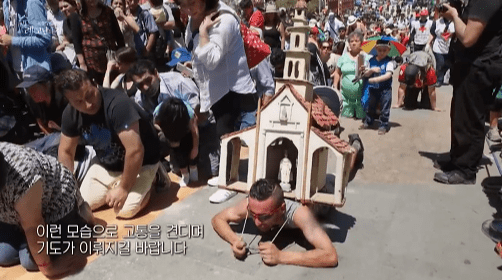 眼前这名34岁的男子叫做丹尼尔,15年前他就开始每年都以这样的方式来这里朝圣,他的弟弟生病了,这么多年来,一直住在医院里都没有好转,为了帮弟弟祈福,丹尼尔踏上了艰难的朝圣之路,15年来从不间断。当他仰面躺在地上,一点一点地挪动到教堂的大堂时,此时大门还没打开,丹尼尔满脸疲倦,但更多的是渴望和虔诚。此时,几乎所有的朝圣者都到了,教堂外已经人山人海,38岁的耶雷斯已经来这里朝圣30年了,他像这样背着教堂模型在地上爬行已经有八年,这个教堂模型重八十公斤,因此耶雷斯的背上留有很多疤痕,他每年步行93公里来这里,以极端的方式忍受着痛苦,他这不仅是为了自己的信仰,更是为了他的小儿子的健康成长,多年以前他已经失去了大儿子,目前小儿子患有呼吸系统疾病,他不想再失去另外一个儿子。