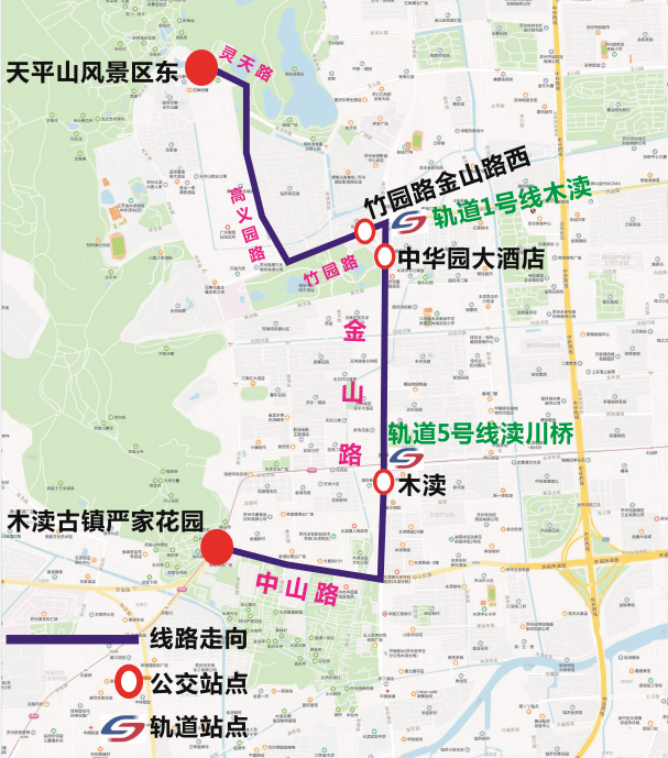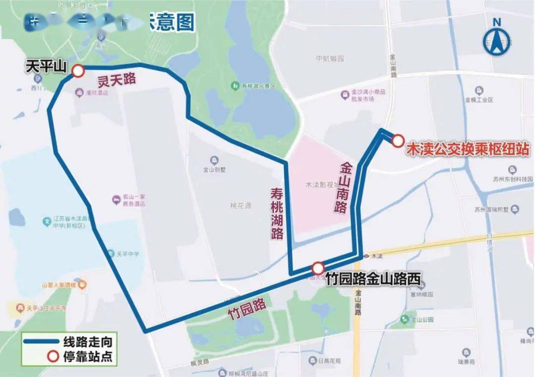 停靠站点:木渎公交换乘枢纽站、竹园路金山路西、天平山(北侧)、竹园路金山路西、木渎公交换乘枢纽站。