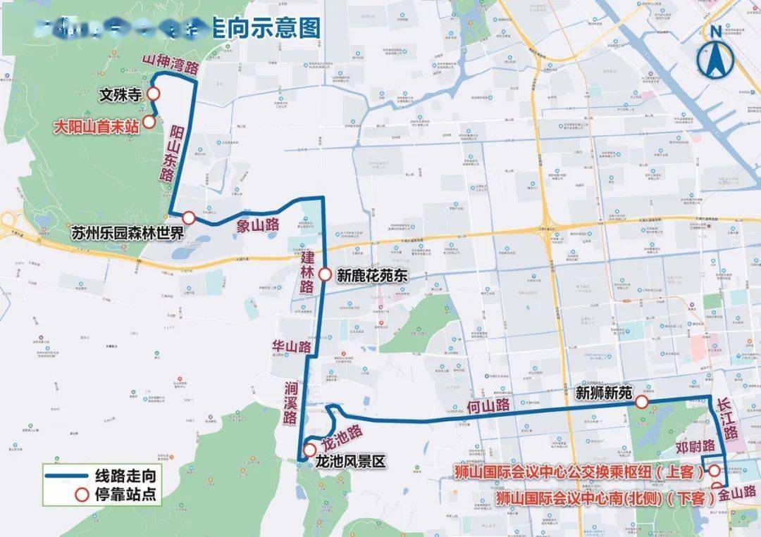 停靠站点:狮山国际会议中心公交换乘枢纽(上客站)、狮山国际会议中心南(北侧下客站)、新狮新苑、龙池风景区、新鹿花苑东、苏州乐园森林世界、文殊寺、大阳山首末站。