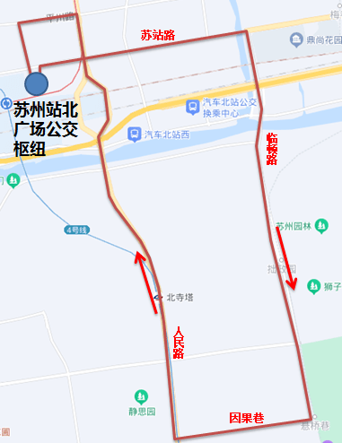 线路起讫点:苏州站北广场公交枢纽-苏州站北广场公交枢纽