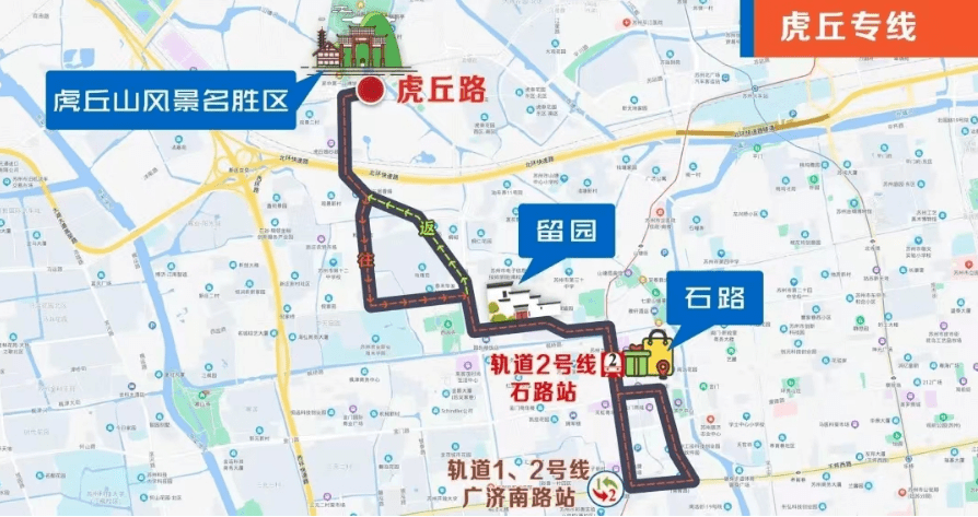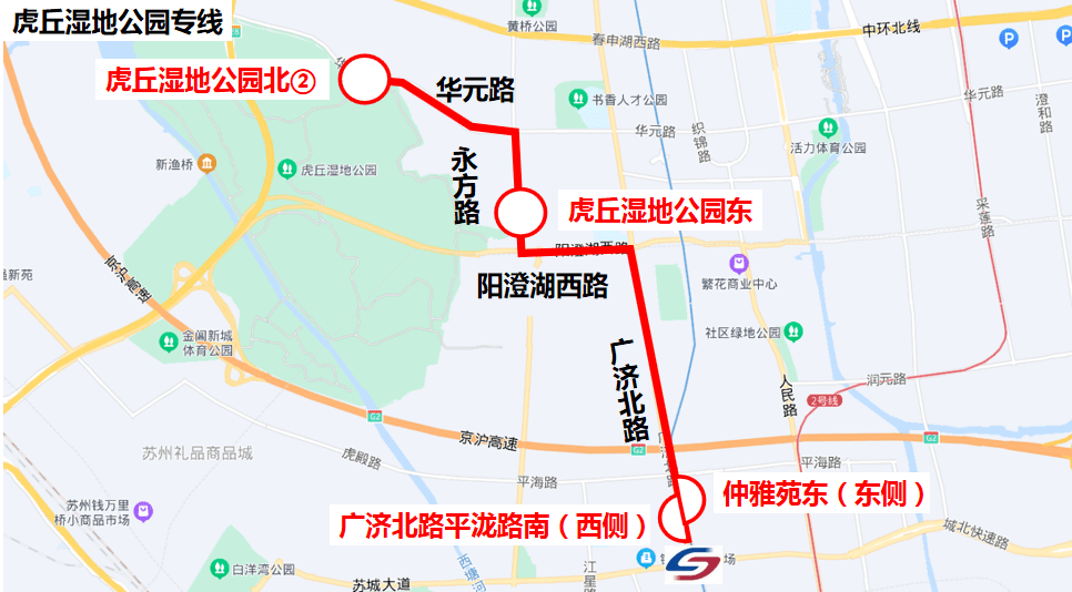 停靠站点:虎丘北门停车场、虎丘湿地公园萌宠乐园、虎丘湿地公园壮志桥、虎丘湿地公园萌宠乐园、虎丘北门停车场