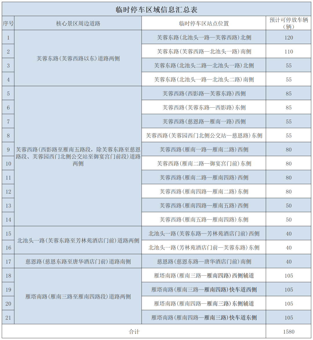此外,“五一”期间,曲江各景区热度不断升温,为做好2023年“五一”劳动节期间曲江新区停车秩序管理工作,保障“五一”期间道路交通畅通有序,方便市民游客出行,在兼顾道路通行和车辆停放的情况下,在景区周边道路设置临时停车区21处。详细信息如下表: