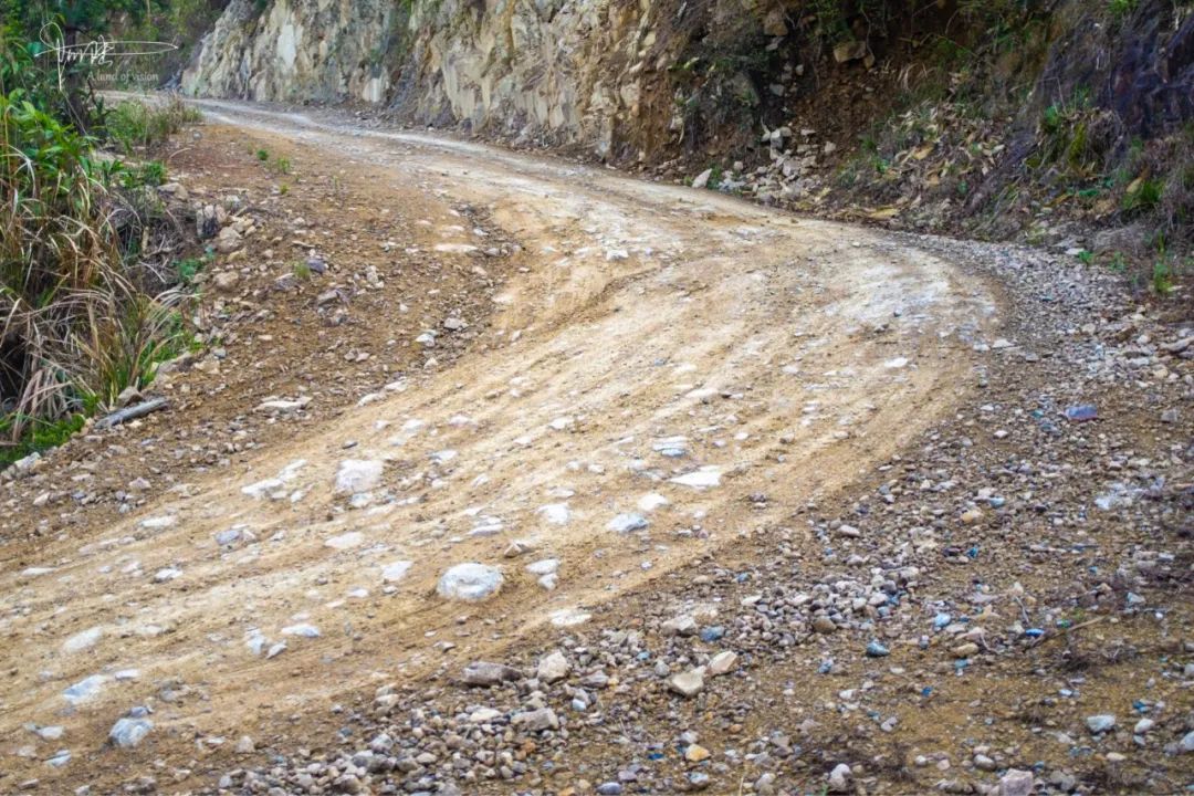 路面不时有岩石突起,且有大量碎石掺杂其间,因此挺有迷惑性,加上不时的泥坑水洼会突然“闪现”一下,可以说必须全神贯注才能应付。幸运的是当天天气晴朗,就没有大量“湿滑”的难度(偶尔一小段会滑,因为路边小瀑布以及山体阴面积存的泥泞)。而工程车经常碾压造成的车辙,也为摩托车提供了相对具有优势的线路,所以只要谨慎控制,难度其实并不是很大。