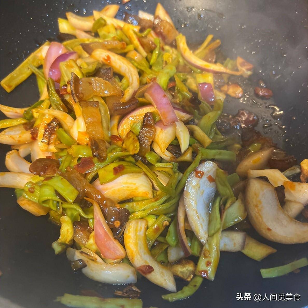 最后就是奶奶去山上挖的竹笋,这个竹笋特别新鲜,拿回家还要自己剥皮,腊肉是奶奶今年自己新做的腊肉,外皮看着黑黑的不起眼,其实切开之后就特别漂亮,奶奶选了一块肥肉多瘦肉少的腊肉,切成薄片特别好看,铁锅烧热倒入切好的腊肉,慢火煸出猪油,然后倒入蒜头翻炒,再倒入青椒继续翻炒,最后倒入竹笋再调味,因为本身腊肉就有味道了,所以简单加一点白糖或者蚝油提味就可以了,翻炒片刻就可以盛出来了。