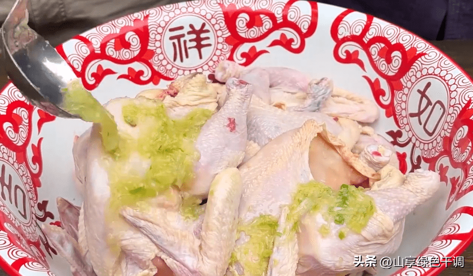 4.把腌料水均匀的涂抹在鸡身上,主要起到去腥除异的作用。腌制半个小时后,用水把鸡清洗干净。