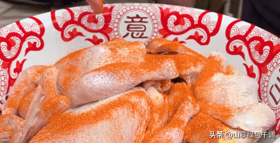 6.按照1斤鸡放20到25克左右的腌料,3克胡椒粉,8克盐大的比例给鸡调味,用手不停的抓匀。腌制三个小时。