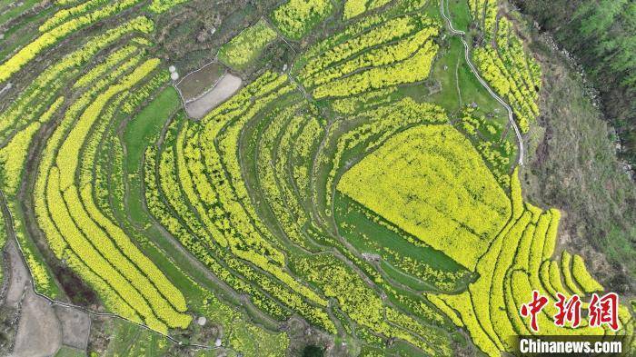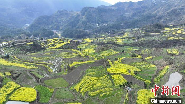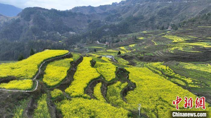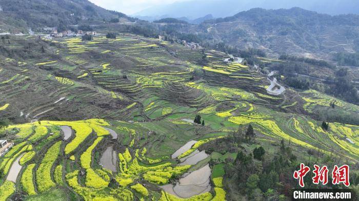 3月底,重庆市酉阳土家族苗族自治县花田乡何家岩村梯田中盛开的油菜花与农舍、道路相映成趣,美不胜收。