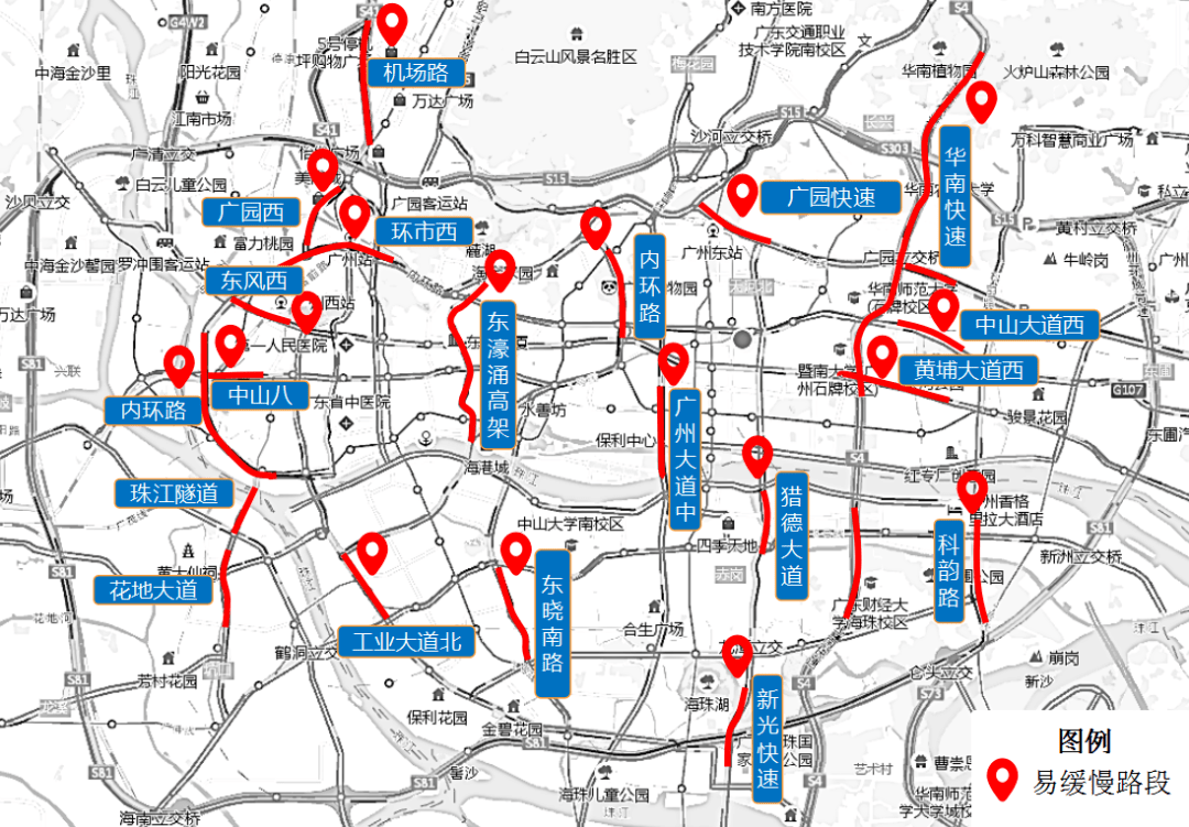 路段方面,预计拥堵路段主要分布在机场高速(三元里—平沙立交段)、华南快速路(春岗立交—太和立交段)、北环高速(沙贝立交段)、京港澳高速(大广高速出口—瓦窑岗服务区段)、广澳高速(横沥立交—坦尾桥)、莞佛高速(坦尾立交—虎门大桥段)、乐广高速(花山互通立交—花山隧道段)、北三环(机场北立交—杨荷立交)、南二环(鱼窝头立交—张松立交段)等瓶颈路段。