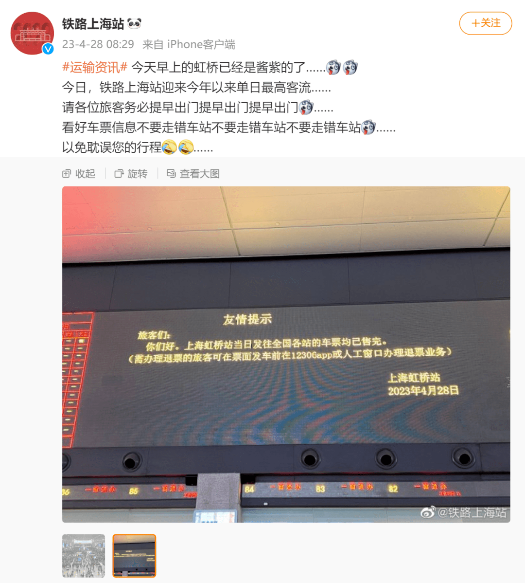 昨日早上,上海虹桥站大屏就已显示“上海虹桥站当日发往全国各站的车票均已售完”。
