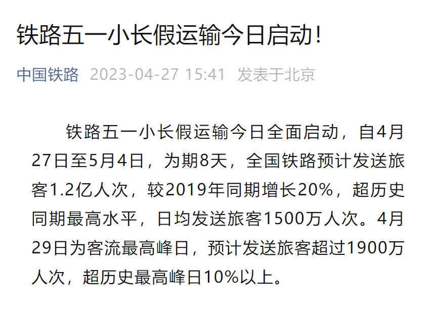 铁路五一小长假运输27日全面启动,自4月27日至5月4日,为期8天,全国铁路预计发送旅客1.2亿人次,较2019年同期增长20%,超历史同期最高水平。