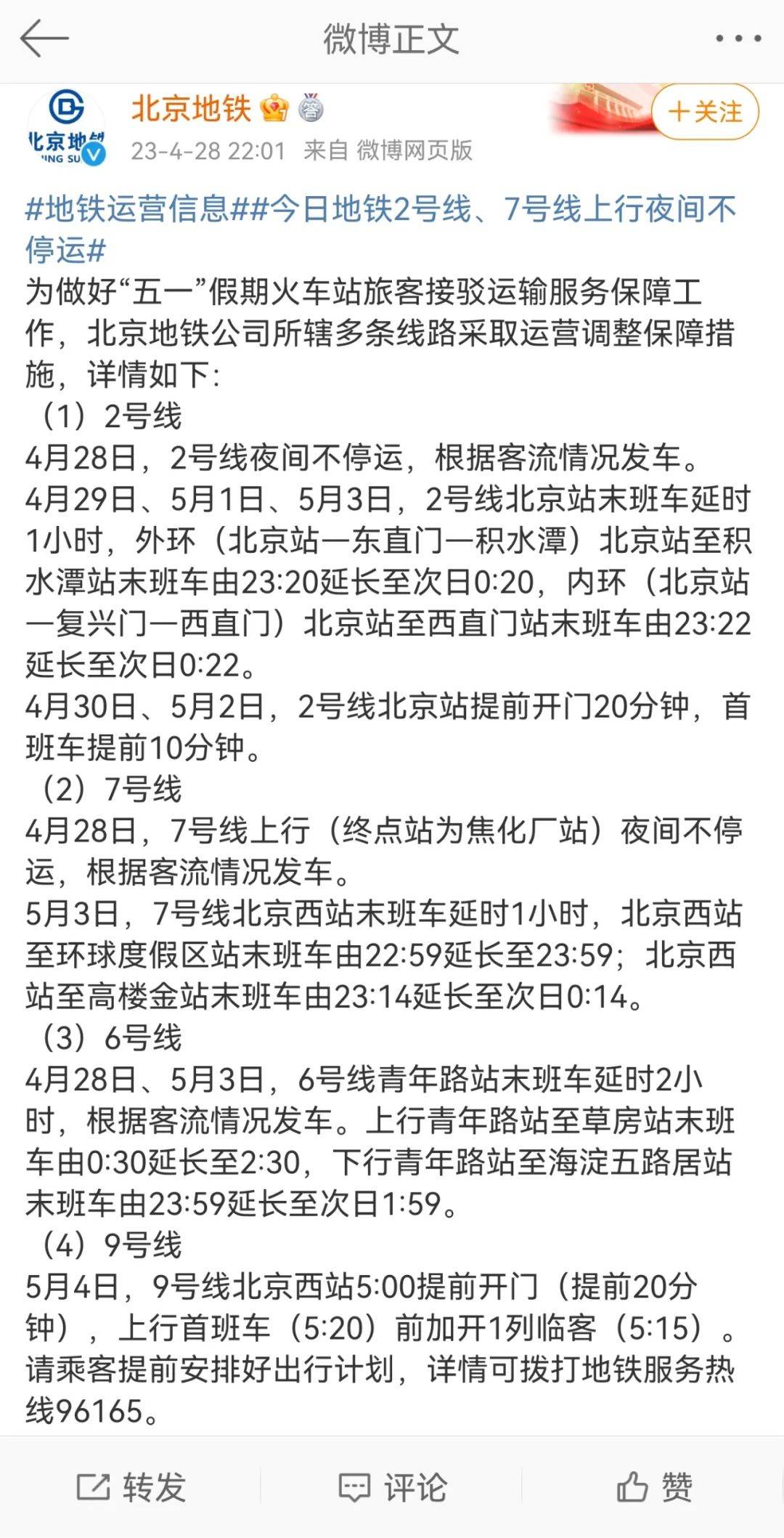 4月28日,北京地铁2号线、7号线上行(终点站为焦化厂站)夜间不停运,根据客流情况发车。