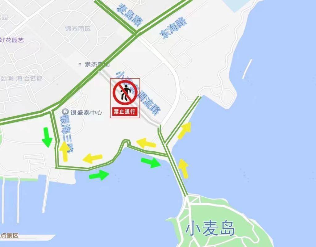 自2023年4月27日至2025年4月30日,麦岛路因施工封闭,麦岛路西侧的临时调流路只允许岛内单位车辆、公交车辆、施工车辆进出,禁止其他社会车辆和行人通行(已设置禁行标志)。游客可以乘坐公共交通工具或者将车辆停放到银海大世界后,绕行银海三路等其它通道步行进入小麦岛。