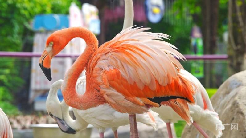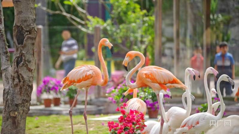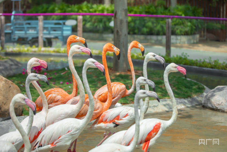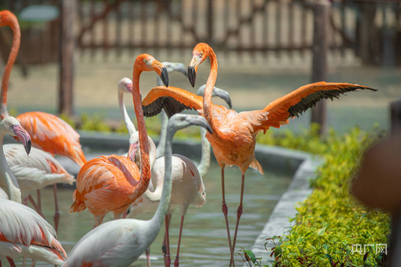 火烈鸟又叫红鹳。据园区负责人介绍,这群“贵客”是由两个独立的“家庭”组成的,分别是4只美洲红鹳及21只大红鹳,其鲜艳的羽毛颜色来源于它们食物中的类胡萝卜素。其中美洲红鹳家庭成员身披“粉色外衣”,羽毛光泽明艳,远远看去,就像一团熊熊燃烧的烈火。大红鹳则穿上了白色外套,仅在翅羽上抹上一点玫瑰浅粉,漫步时诸色相衬,非常美丽。