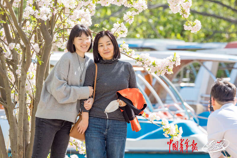 在奥林匹克森林公园的一棵海棠花树下,游客正在拍照。在社交媒体平台上,各种“赏花攻略”“春游指南”成就了许多拍照胜地。中青报·中青网见习记者 吴欣宇/摄