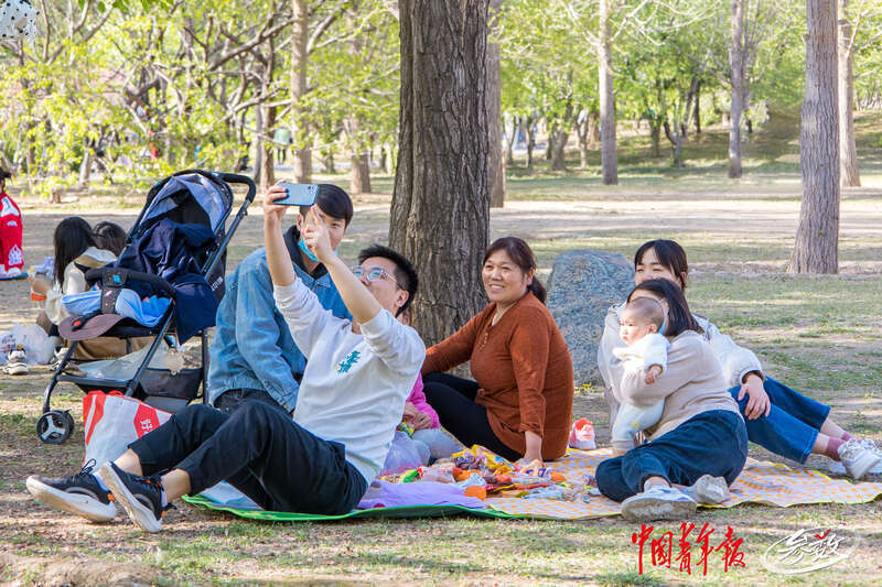 奥林匹克森林公园内,一家人正对着手机镜头合照。 调查显示,50.9%的受访者选择和恋人伴侣一起出行,38.9%的受访者会和朋友共同出游,另外,还有34.6%的受访者和30.2%的受访者分别选择和子女、父母共同出游。中青报·中青网见习记者 吴欣宇/摄